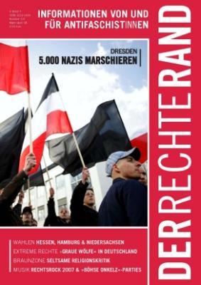 Die aktuelle Ausgabe des DER RECHTE RAND berichtet ferner über den wohl zur Zeit größten Neonaziaufmarsch in Dresden am 16. Februar, Prozesse gegen (Ex-)Mitglieder der verbotenen Gruppen „Sturm 34“ und „Blood & Honour“ bzw. über die Verurteilung der Holocaustleugnerin und ehemaligen Rechtsanwältin Sylvia Stolz, weiterhin über Aktivitäten in der sog. Braunzone wie bei der „Pennalen Burschenschaft Chattia Friedberg zu Hamburg“ oder der „Alten Breslauer Burschenschaft der Raczeks zu Bonn“.