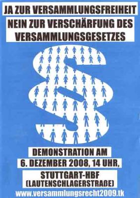 Am 6.12. gibt es in Stuttgart eine Demonstration gegen das geplante neue Versammlungsrecht. Dazu findet am 25. November 2008 / 19:00 Uhr im Gewerkschaftshaus, Willi-Bleicher-Straße 20, Stuttgart-Mitte